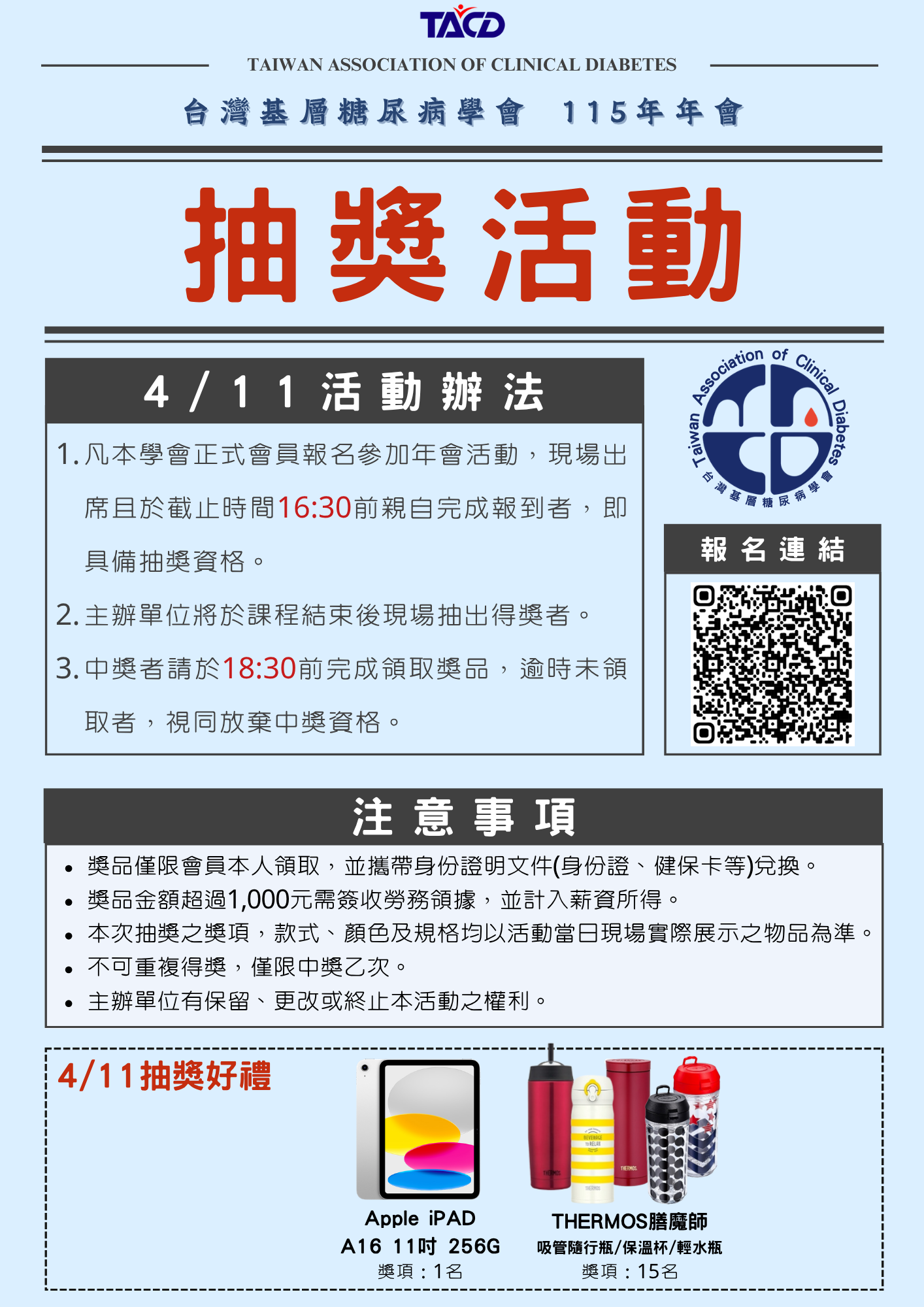 4/12報到&刷退: 學會將依學員簽到及簽退時間核算學分,詳細辦法如下: 全天學分08:30-10:30 間完成報到;14:30-17:00 間完成刷退。 上午學分08:30-10:30 間完成報到;12:30-14:30 間完成刷退。 下午學分10:30-12:30 間完成報到;14:30-17:00 間完成刷退。 |